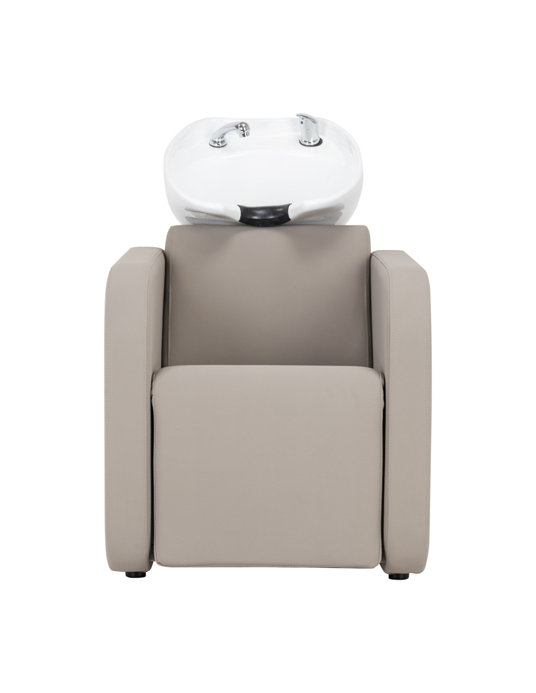 The Gabbiano Sylvia Salon washbasin station has been designed with the aim of comfortably performing care or colouring treatments in mind, as well as providing the client with a comfortable position during longer procedures. It catches the eye with its simplicity and geometric form, while the perpendicular lines of the seat and armrests give it a modern feel. The backrest placed at an optimal angle promotes excellent support for the spine. The appropriately profiled seat filled with durable foam ensures high comfort of use, and the upholstered armrests allow for the correct positioning of the client's shoulders. The synthetic leather cover in shades of beige guarantees many years of durability and ease of cleaning. The elegant, minimalist look of the wash station gives the interior a unique touch. The set includes complete fittings in shades of chrome, including a faucet, shower head and dedicated hoses to provide a complete set of tools for work.