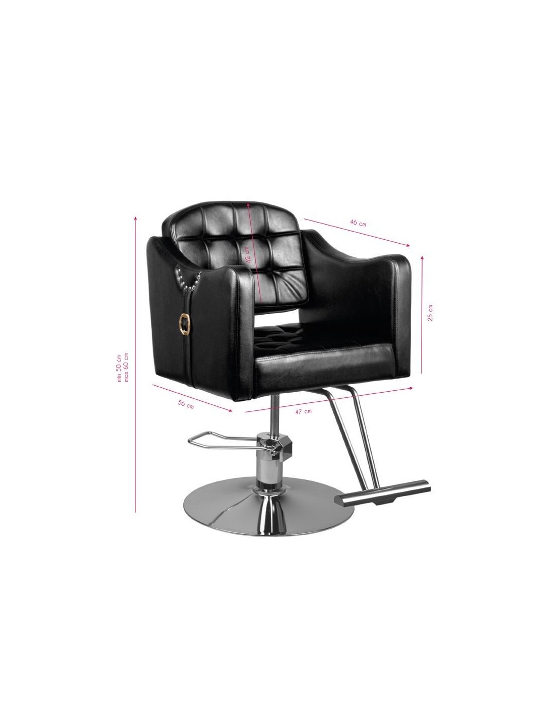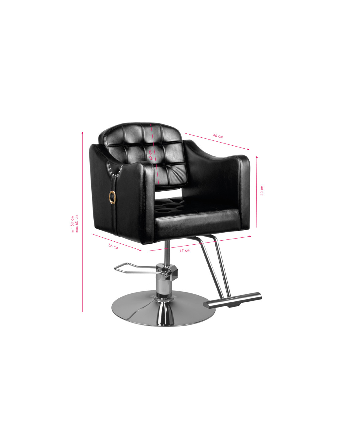 Stylish Styling chair by HAIR SYSTEM. Elagant and very comfortable. A solid, chrome base guarantees the stability of the seat. The upholstery is made of high-quality black eco-leather. The chair is adjustable up and down.