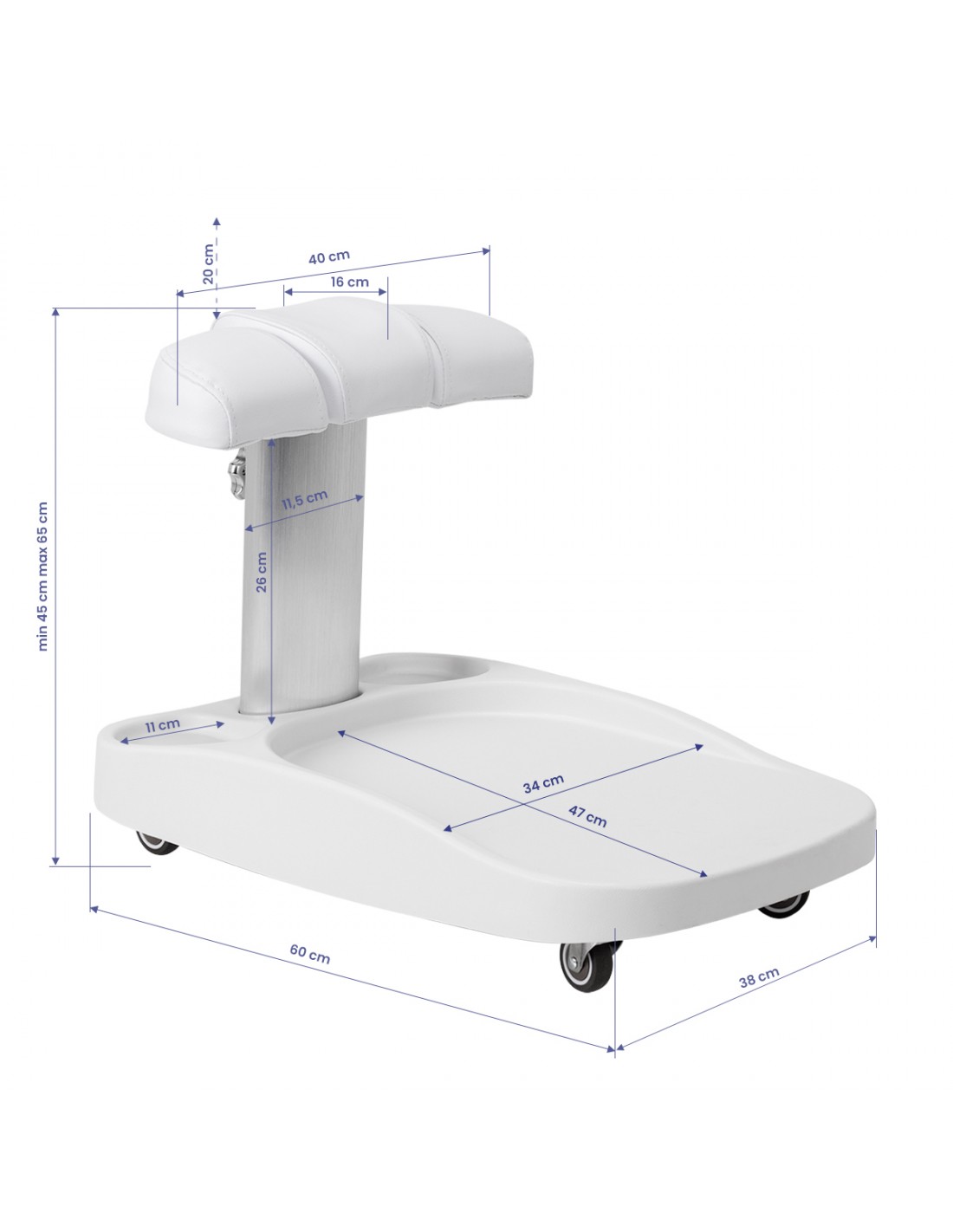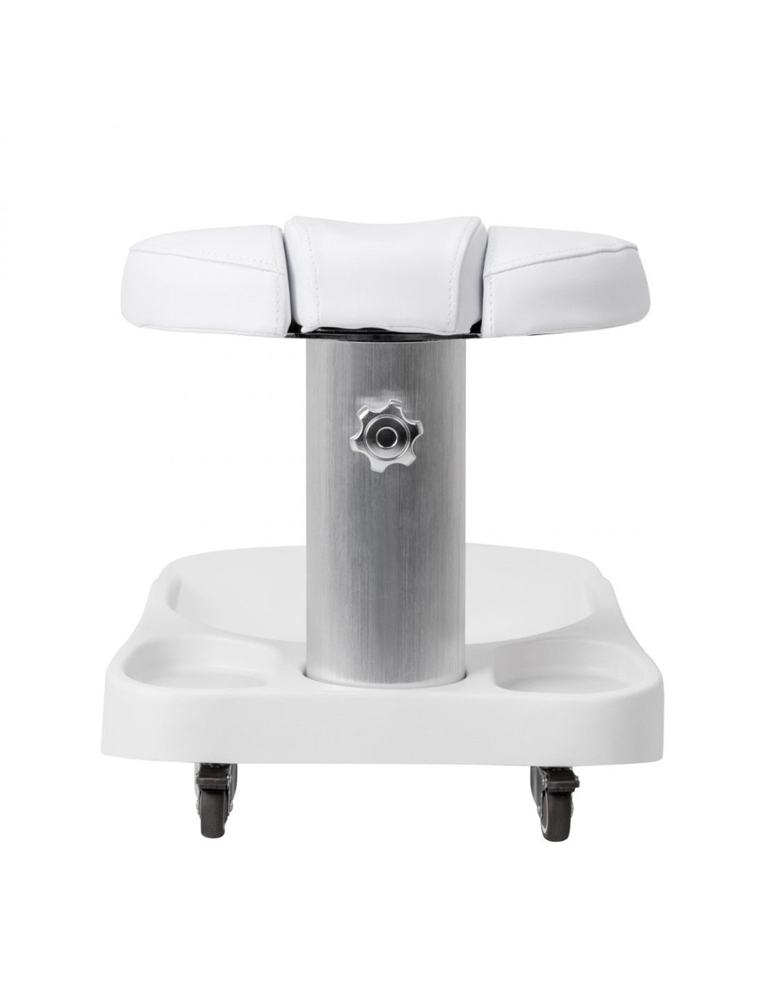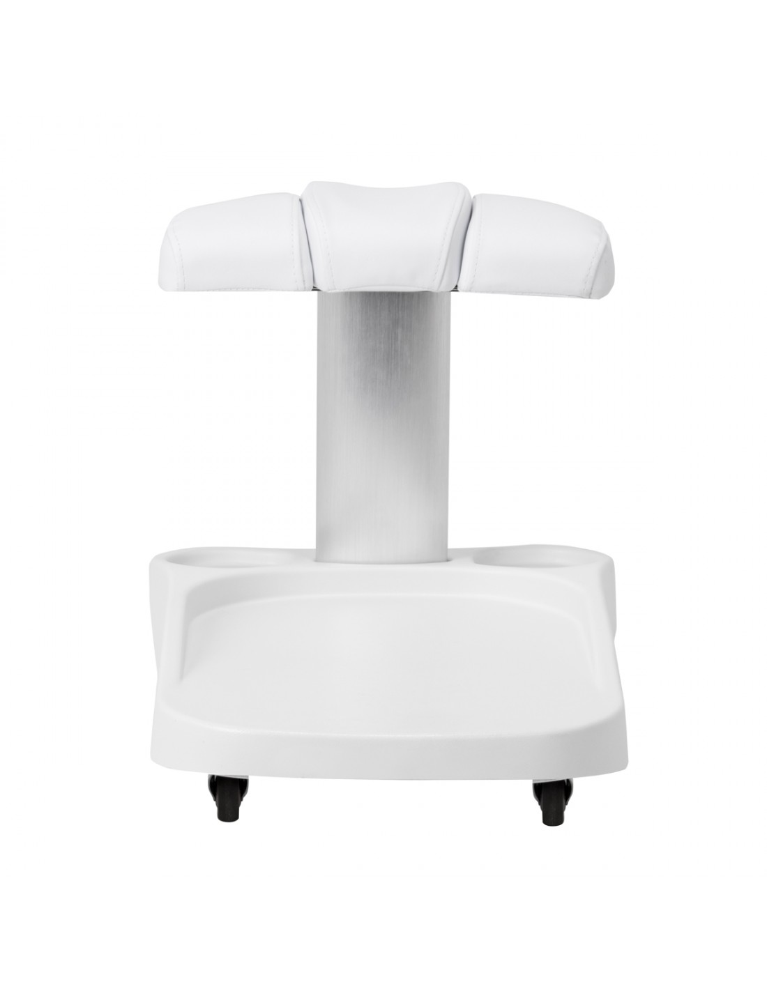 The footrest is made up of three parts, of which the middle one is extendable. Manual height adjustment allows it to be raised by a maximum of 20 cm. All elements of the footrest are upholstered with synthetic leather, which ensures resistance to moisture and ease of cleaning. As a result, the trolley can be adjusted to the individual needs of the user, which makes it an excellent solution for both cosmetic and podiatric treatments, ensuring comfort and precision of work in various positions.