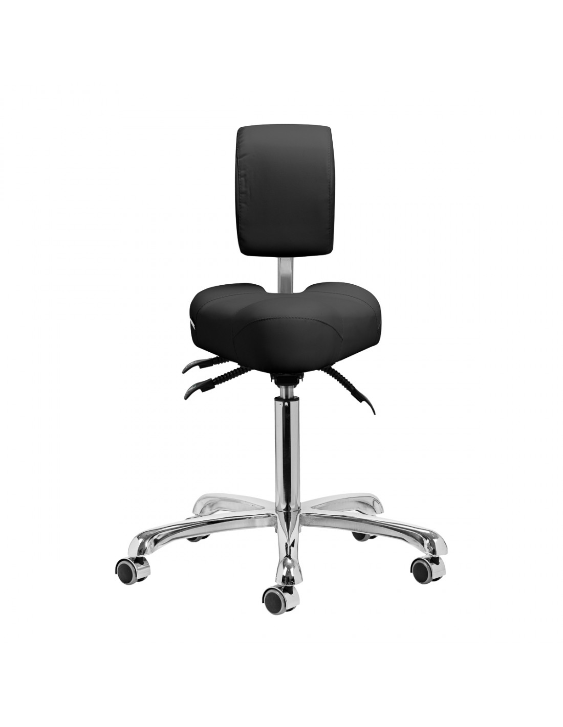 Adjustable height in the range of 55-72 cm allows adopting the proper position while performing services. The perfectly shaped adjustable backrest provides optimal support for the lumbar region, minimizing fatigue during prolonged work. The full rotation mechanism makes work more efficient and comfortable. Additionally, the stool features a locking cradle function, enabling ergonomic body positioning. The seat allows for tilt and height adjustment via gas cylinders, and the height of the backrest can be manually adjusted for complete comfort.