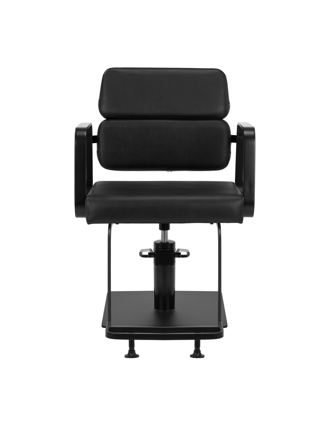 The full rotation mechanism of the chair makes the hairdresser's work more effective and comfortable. A solid, flat, square-shaped base guarantees stability during use. The matte-finished, smooth surface gives the element an elegant look and makes it easy to keep clean. A comfortable seat with foam filling ensures high comfort of use, even during many hours of treatments. Geometric, metal armrests allow for the correct positioning of the client's shoulders – this means that he does not bury his head in his shoulders or slouch – which makes it much easier to perform precise treatments, including haircuts. A stylish footrest dedicated to this model provides stable support for the user's feet.