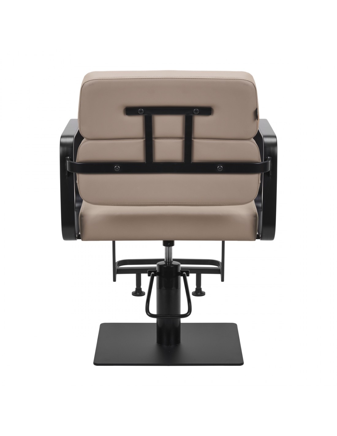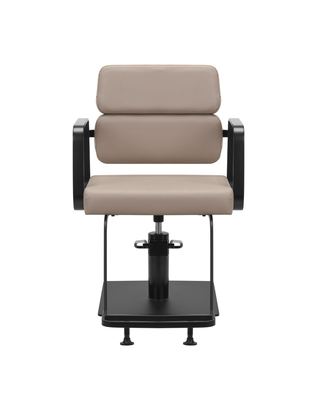 The full rotation mechanism of the chair makes the hairdresser's work more effective and comfortable. A solid, flat, square-shaped base guarantees stability during use. The matte-finished, smooth surface gives the element an elegant look and makes it easy to keep clean. A comfortable seat with foam filling ensures high comfort of use, even during many hours of treatments. Geometric, metal armrests allow for the correct positioning of the client's shoulders – this means that he does not bury his head in his shoulders or slouch – which makes it much easier to perform precise treatments, including haircuts. A stylish footrest dedicated to this model provides stable support for the user's feet.