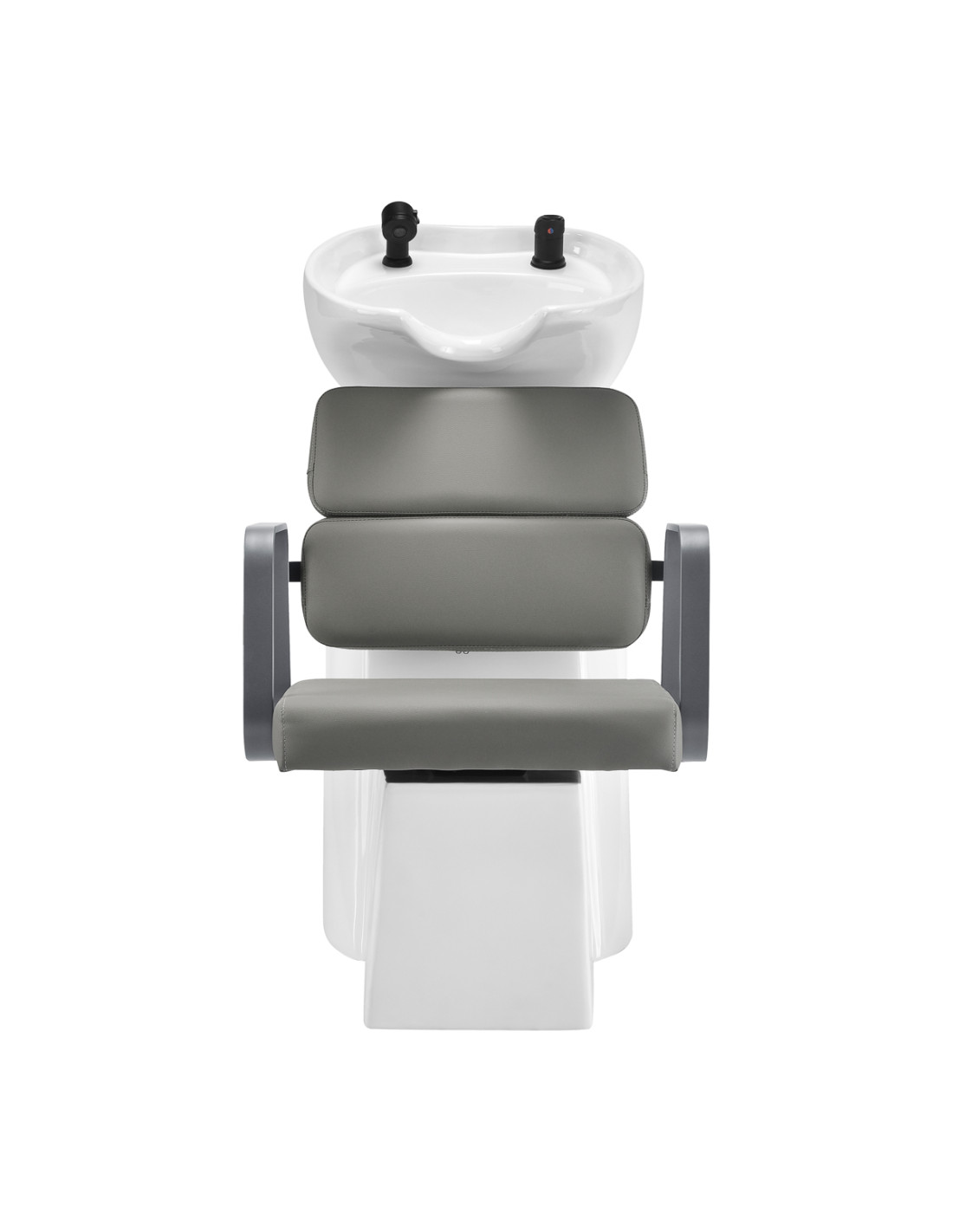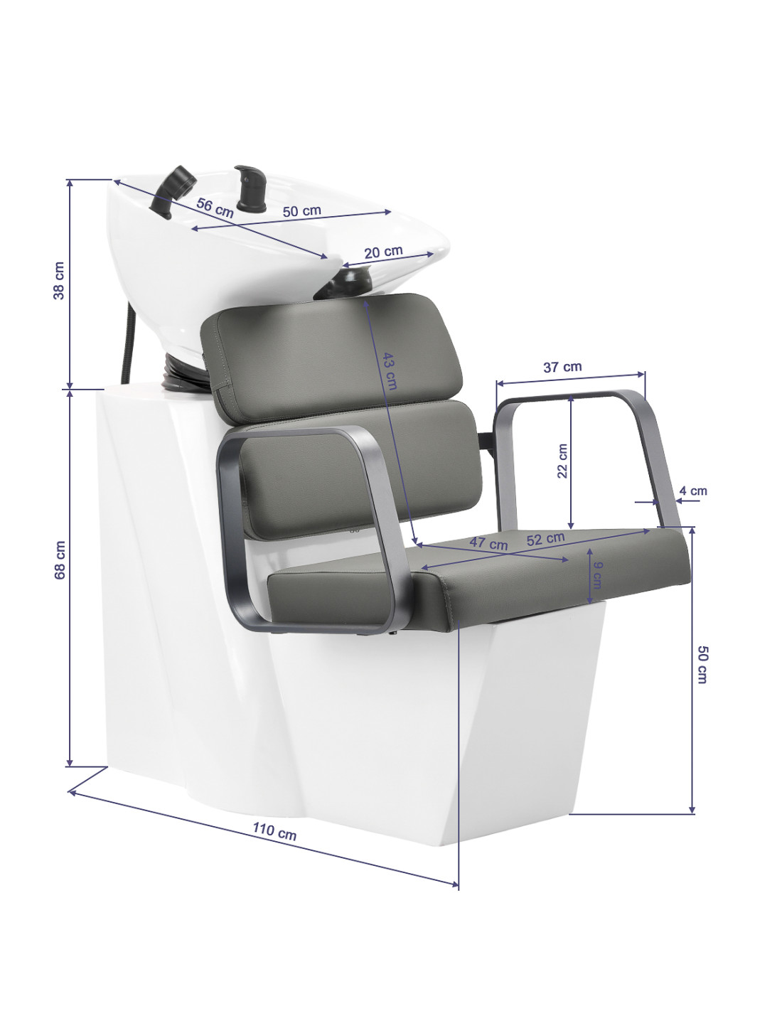 The profiled chair provides adequate lumbar support and, therefore, high comfort of use. Metal armrests in shades of gry with a geometric shape allow for the correct positioning of the customer's shoulders. Filling with durable, deformation-resistant foam and upholstery made of pleasant-to-touch synthetic leather in shades of gray ensure the durability of the furniture, ease of cleaning and comfortable use for a long time. The original, elegant appearance of the hair wash unit gives the interior a unique expression. The set includes complete fittings in shades of black, including a faucet, a shower head and dedicated hoses to provide a complete set of tools for work.