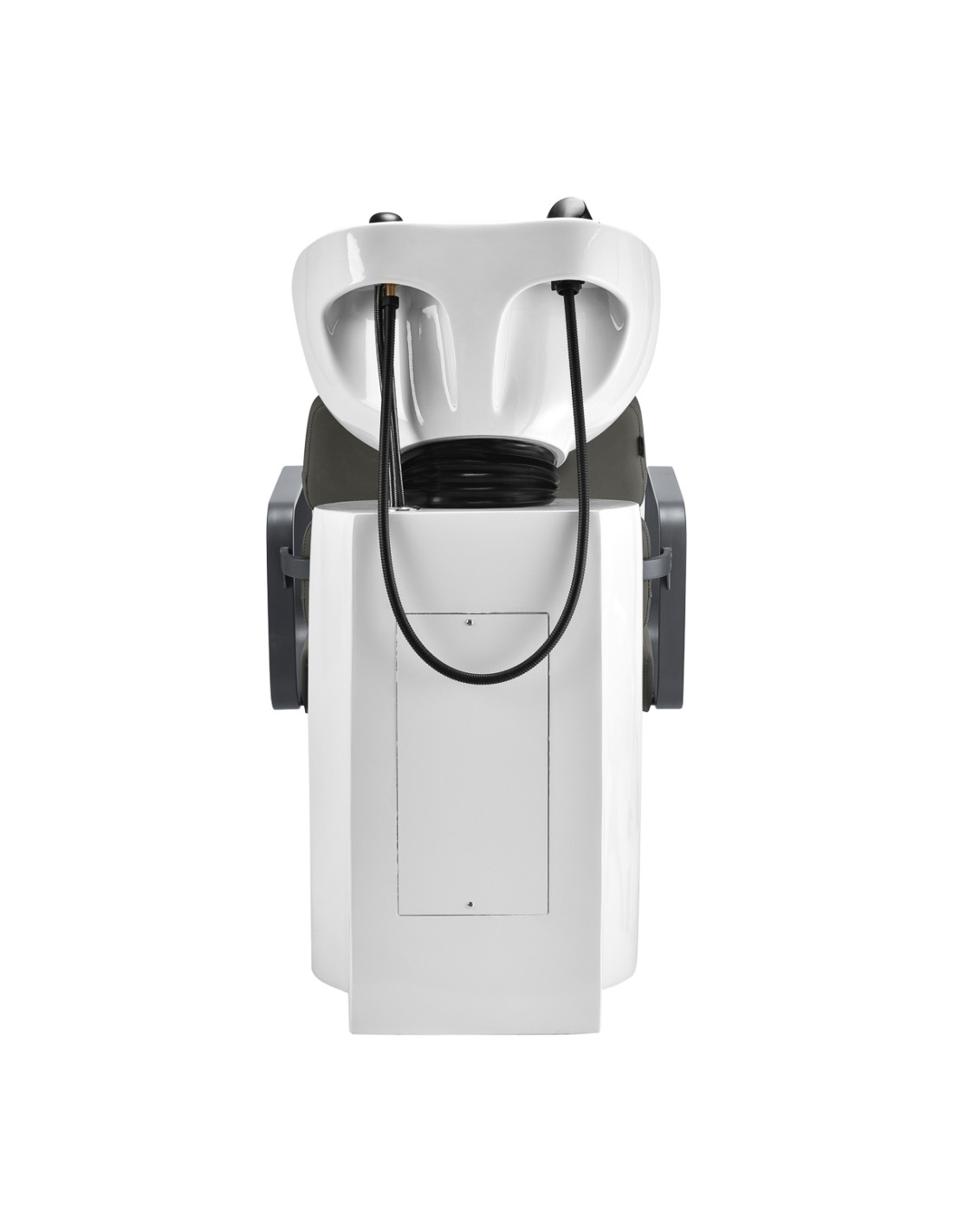 The practical hair wash unit is equipped with a mixer faucet, which provides easy access to hot and cold water. This makes it easier to adjust the temperature to the customer's individual preferences. A dedicated place to hang up the handset makes work easier, and the chrome-plated plug with a special strainer allows you to control the water flow and maintain high hygiene standards in the salon. The water connection has been placed inside the base, allowing the pipes to be easily hidden. A significant advantage of this model is the opening left between the backrest and the seat, which makes it easier to keep the living room clean by allowing you to easily sweep dirt from every nook and cranny of the chair. The hair wash unit has been designed in such a way as to ensure comfort during various treatments, ensuring proper back support. The combination of functionality and amenities makes working in a hairdressing salon even more comfortable.