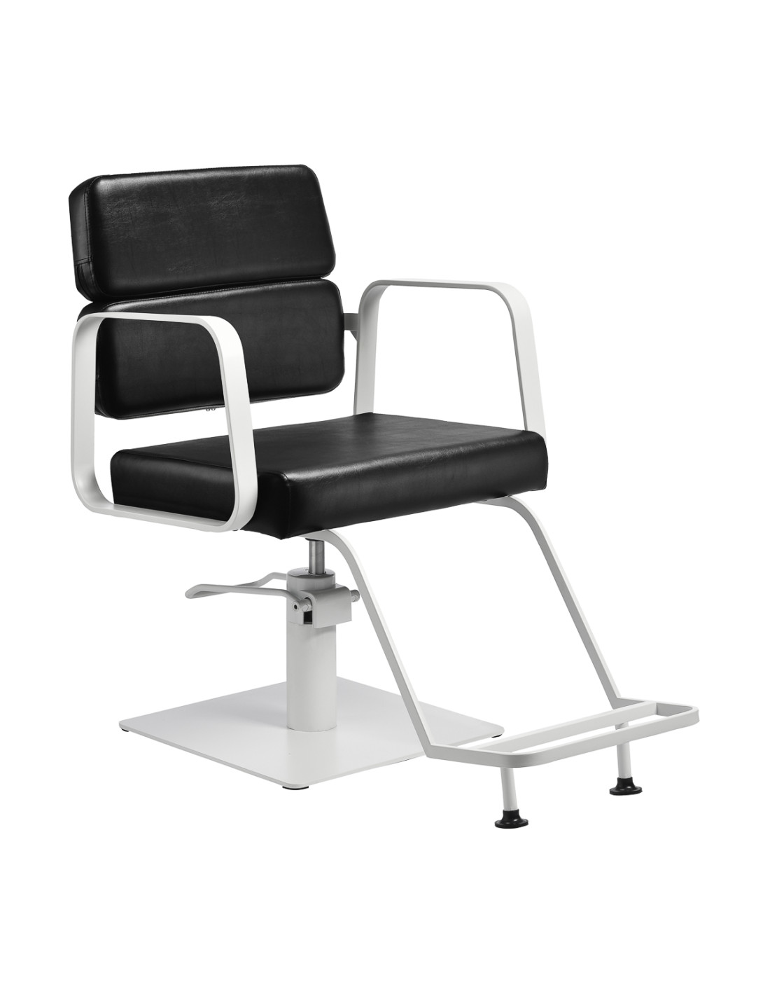 The full rotation mechanism of the chair makes the hairdresser's work more effective and comfortable. A solid, flat, square-shaped base guarantees stability during use. The matte-finished, smooth surface gives the element an elegant look and makes it easy to keep clean. A comfortable seat with foam filling ensures high comfort of use, even during many hours of treatments. Geometric, metal armrests allow for the correct positioning of the client's shoulders – this means that he does not bury his head in his shoulders or slouch – which makes it much easier to perform precise treatments, including haircuts. A stylish footrest dedicated to this model provides stable support for the user's feet.