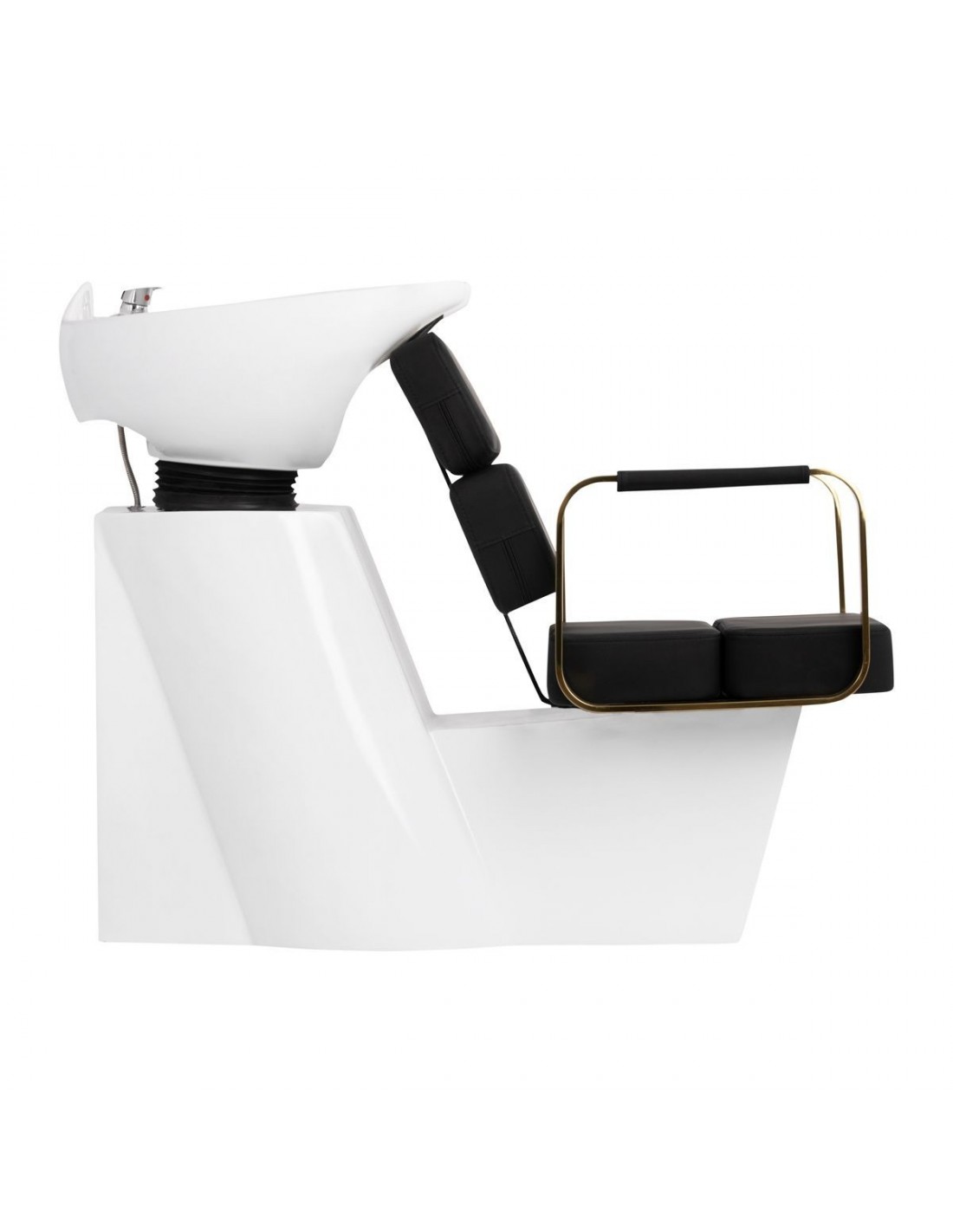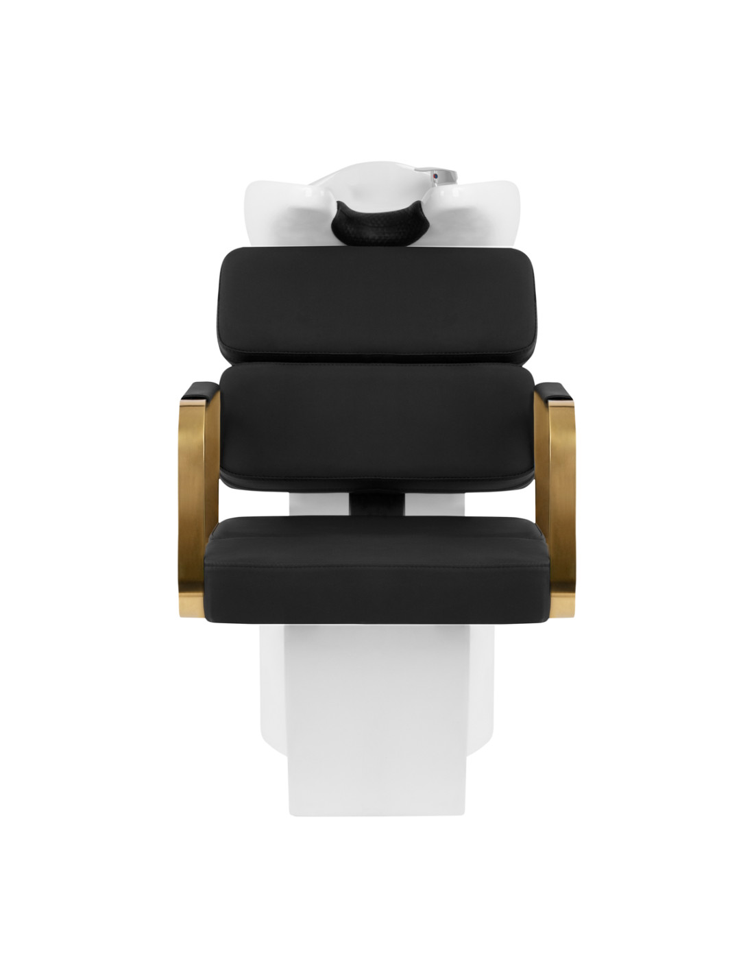 The modern Gabbiano Salon washbasinbasin is a combination of functionality and Italian elegance. The washbasin is made of the highest quality materials and perfectly finished. We know how important the client's comfort is during treatments, which is why the special design provides the client with solid head support while washing. The soft and extremely comfortable seat is covered with high-quality gray eco-leather. This washpoint has a white ceramic bowl and gold armrests. The perfect piece of furniture for modern interiors. Painted metal surfaces.