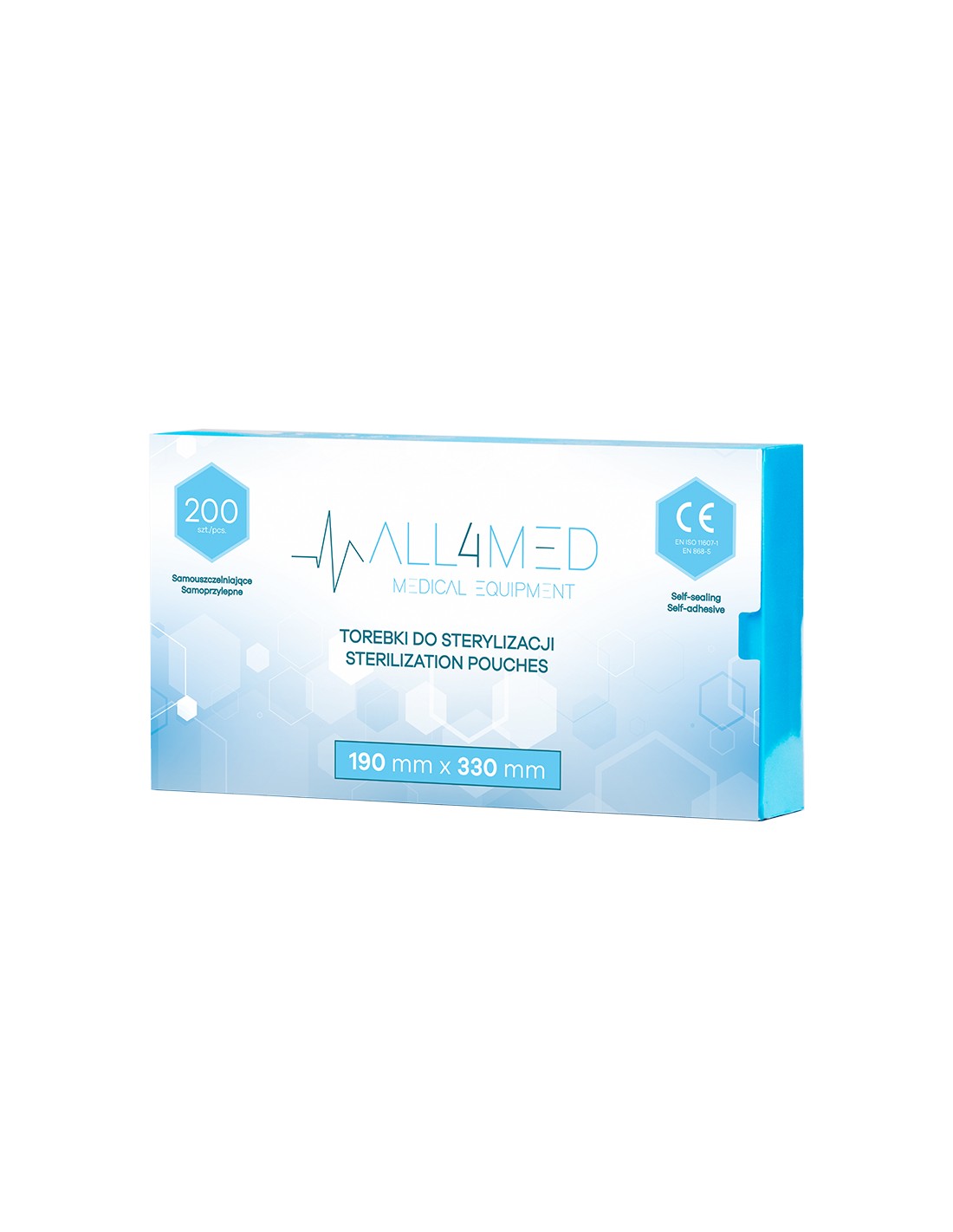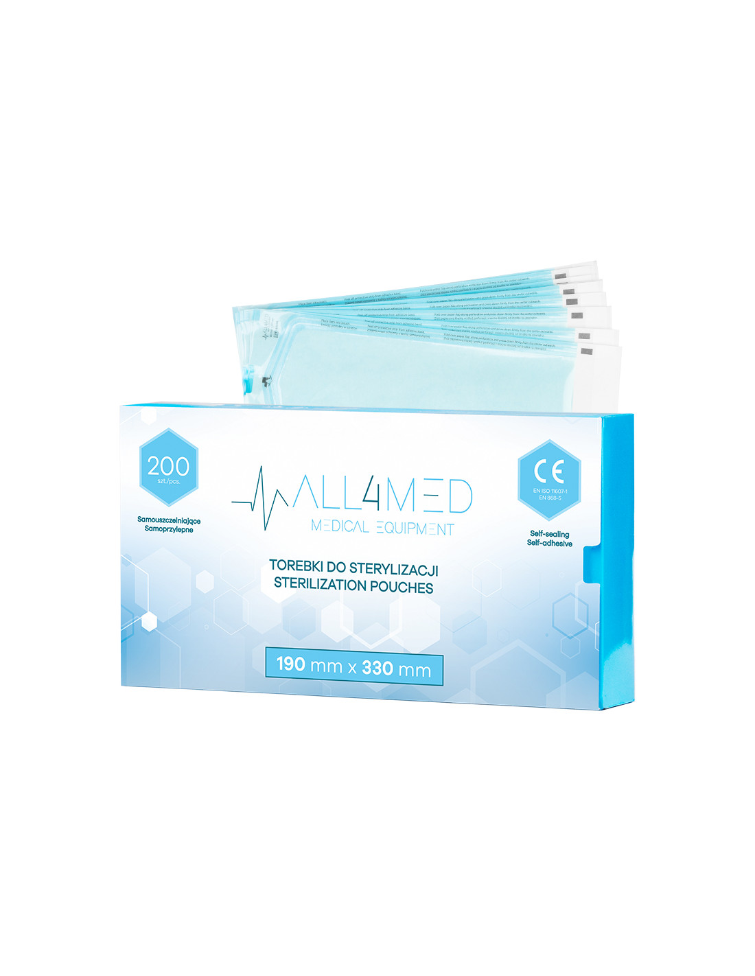 ALL4MED all4med high-quality self-adhesive foil and paper bags are made of materials that meet all the required medical standards. are equipped with a self-adhesive tape thanks to which there is no need to use a welding machine the indicator placed on the product will confirm the correct sterilization process by changing its color. bags are designed for steam sterilization.