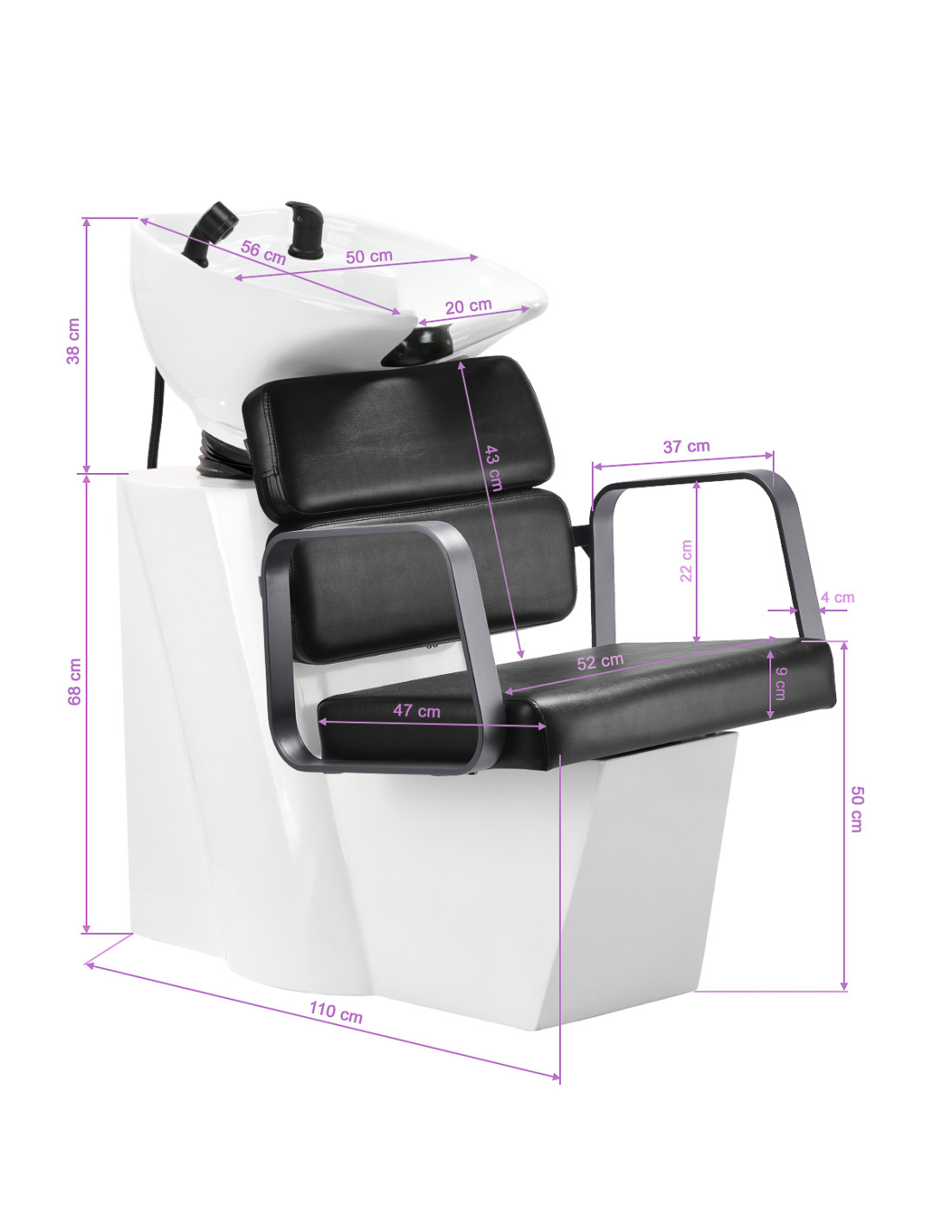 The profiled chair provides adequate lumbar support and, therefore, high comfort of use. Metal armrests in shades of gry with a geometric shape allow for the correct positioning of the customer's shoulders. Filling with durable, deformation-resistant foam and upholstery made of pleasant-to-touch synthetic leather in shades of black ensure the durability of the furniture, ease of cleaning and comfortable use for a long time. The original, elegant appearance of the hair wash unit gives the interior a unique expression. The set includes complete fittings in shades of black, including a faucet, a shower head and dedicated hoses to provide a complete set of tools for work.