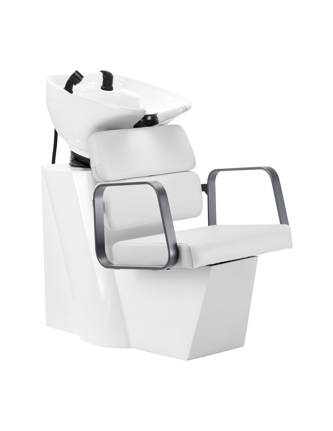 The profiled chair provides adequate lumbar support and, therefore, high comfort of use. Metal armrests in shades of gry with a geometric shape allow for the correct positioning of the customer's shoulders. Filling with durable, deformation-resistant foam and upholstery made of pleasant-to-touch synthetic leather in shades of white ensure the durability of the furniture, ease of cleaning and comfortable use for a long time. The original, elegant appearance of the hair wash unit gives the interior a unique expression. The set includes complete fittings in shades of black, including a faucet, a shower head and dedicated hoses to provide a complete set of tools for work.